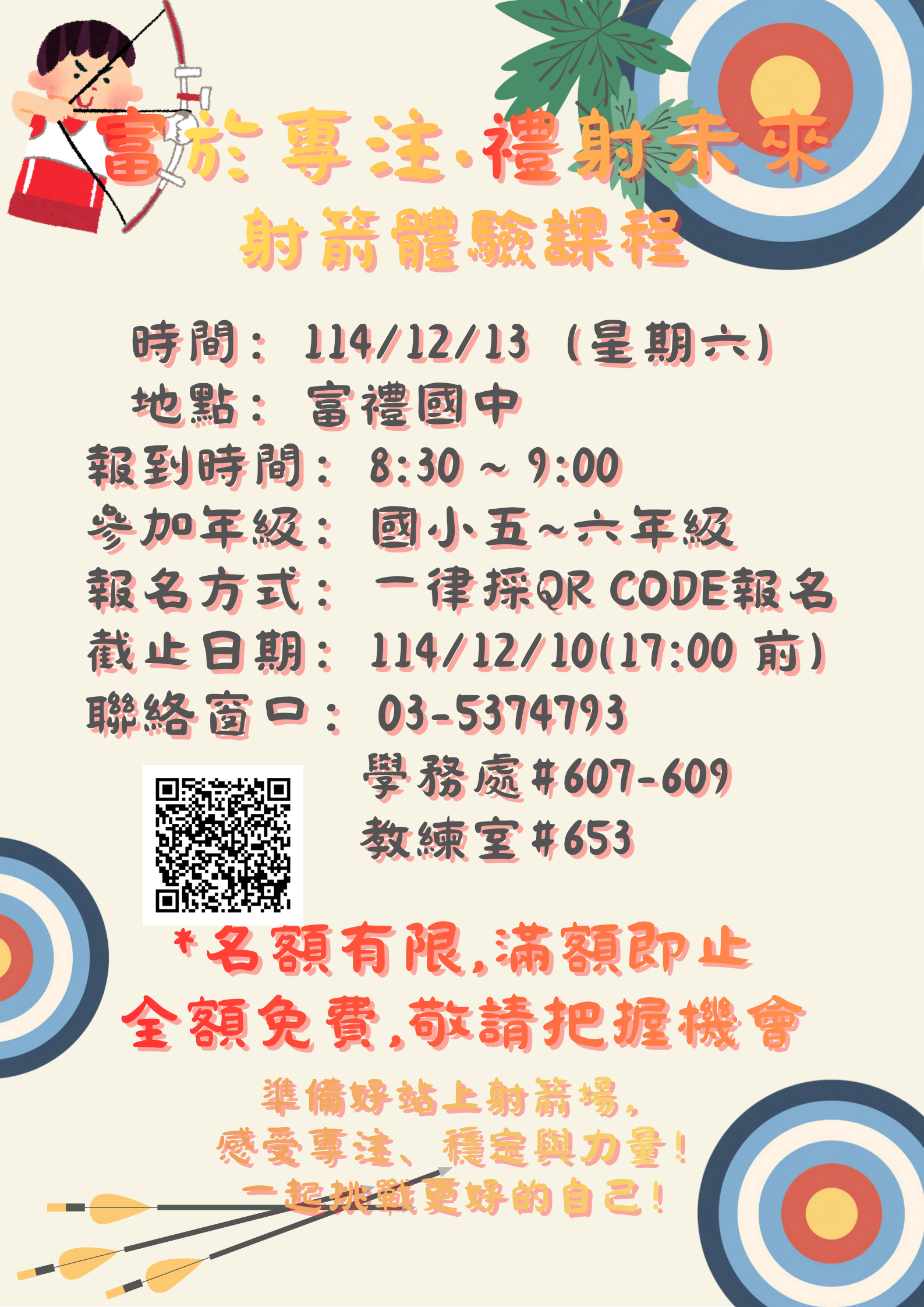 | 一、 | 富禮國中為推廣射箭運動及強化學生專注力與運動素養,本校特舉辦國小學生射箭體驗活動,詳細活動資訊如下:。 |