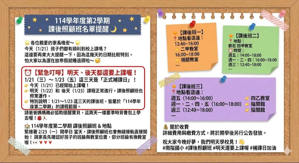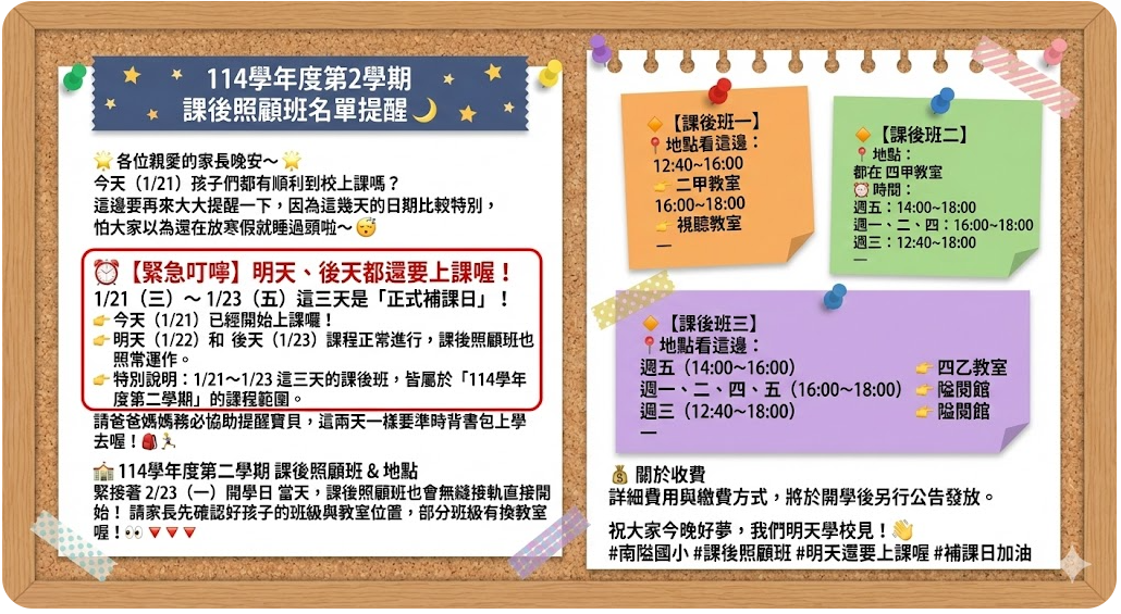 依據學校行事曆,114年1月21日(三)至1月23日(五) 為正式補課日,全校依週三至週五課表正常上課。 在此期間,課後照顧班亦同步開始運作,課程歸屬於「114學年度第2學期」範圍,請家長協助提醒學生準時出席。
