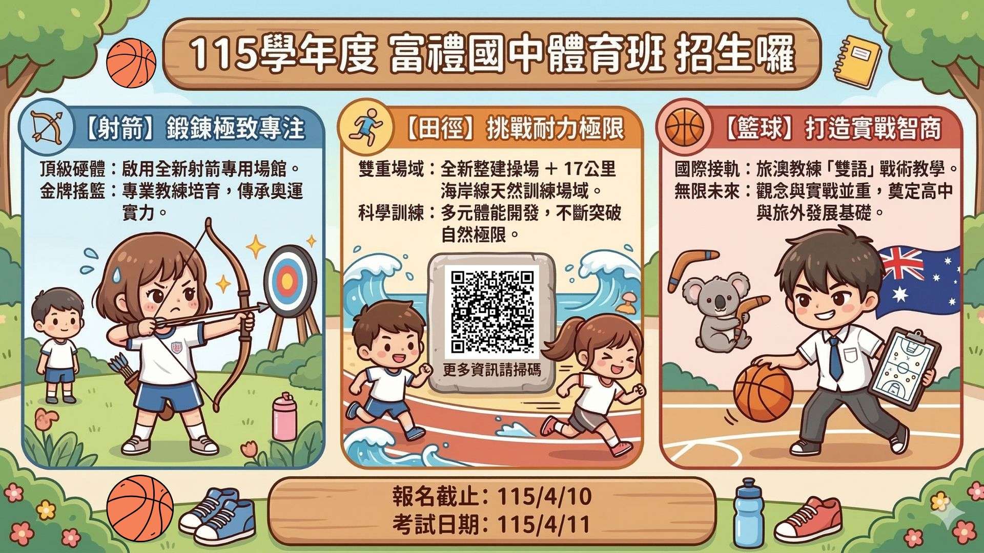 | 二、 | 本校115學年度體育班甄試項目為射箭、田徑、籃球,期能招收貴校優秀應屆(畢業)生,敬請廣為宣傳招生資訊,詳細甄選資訊如下: |